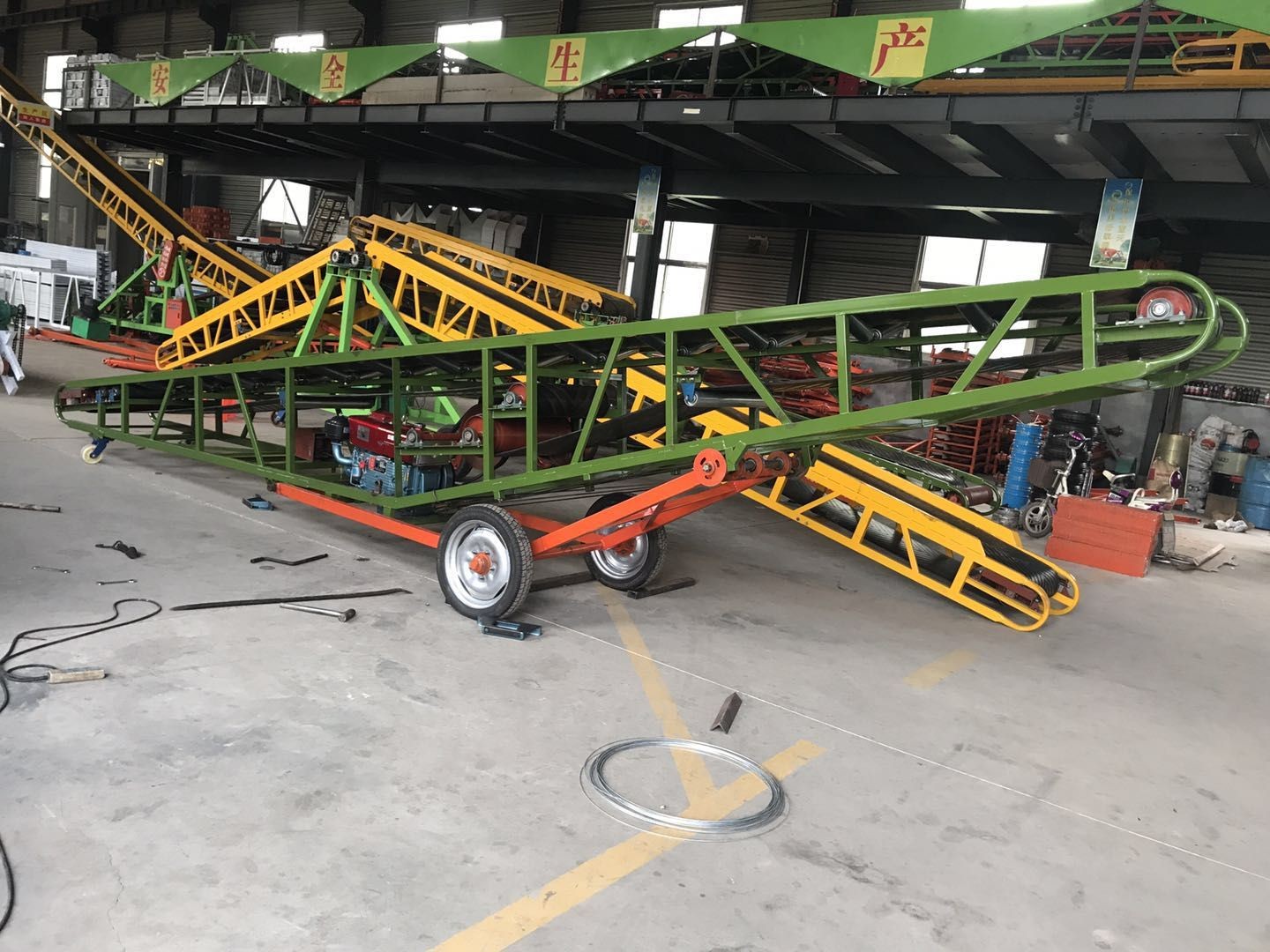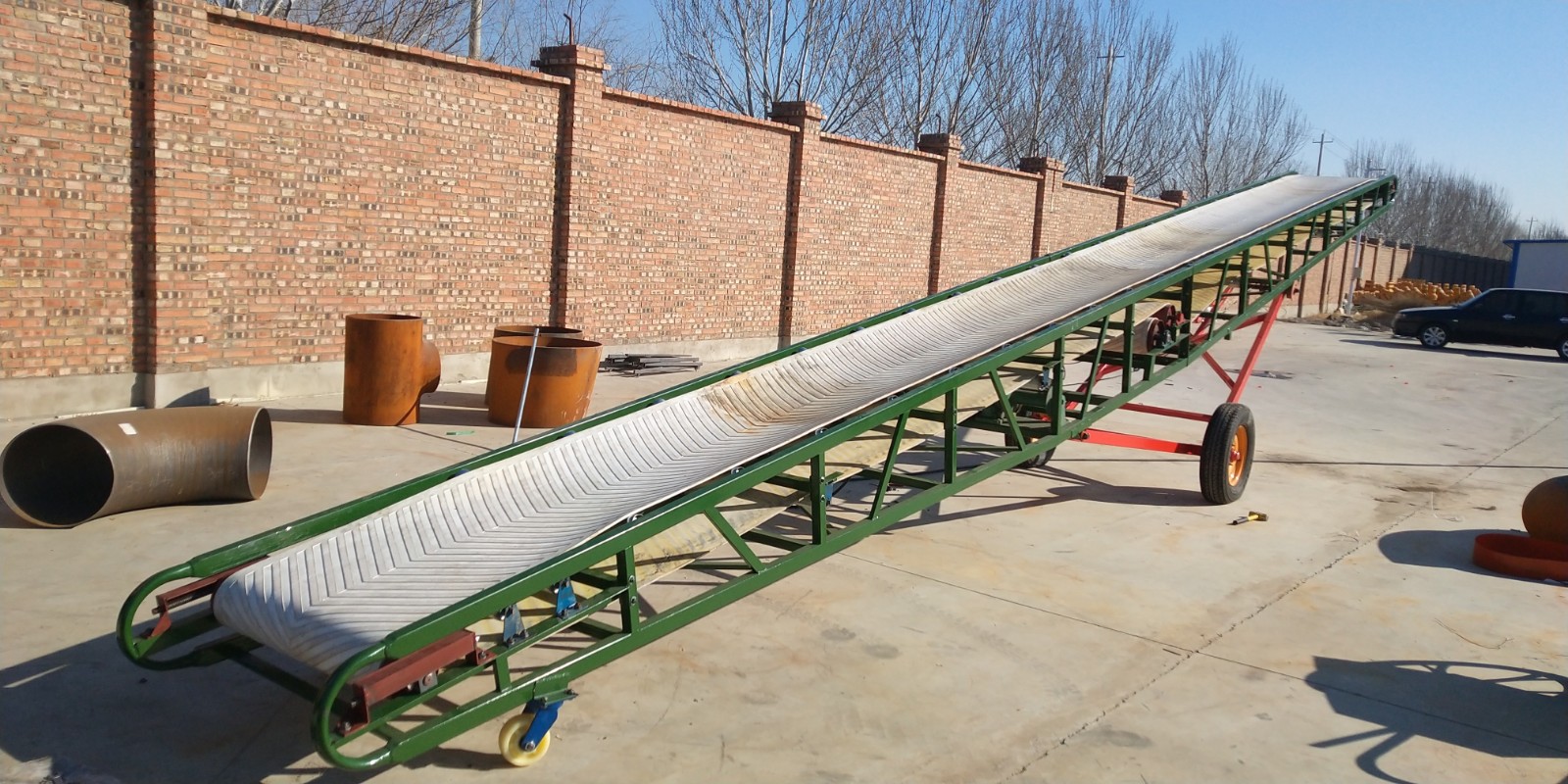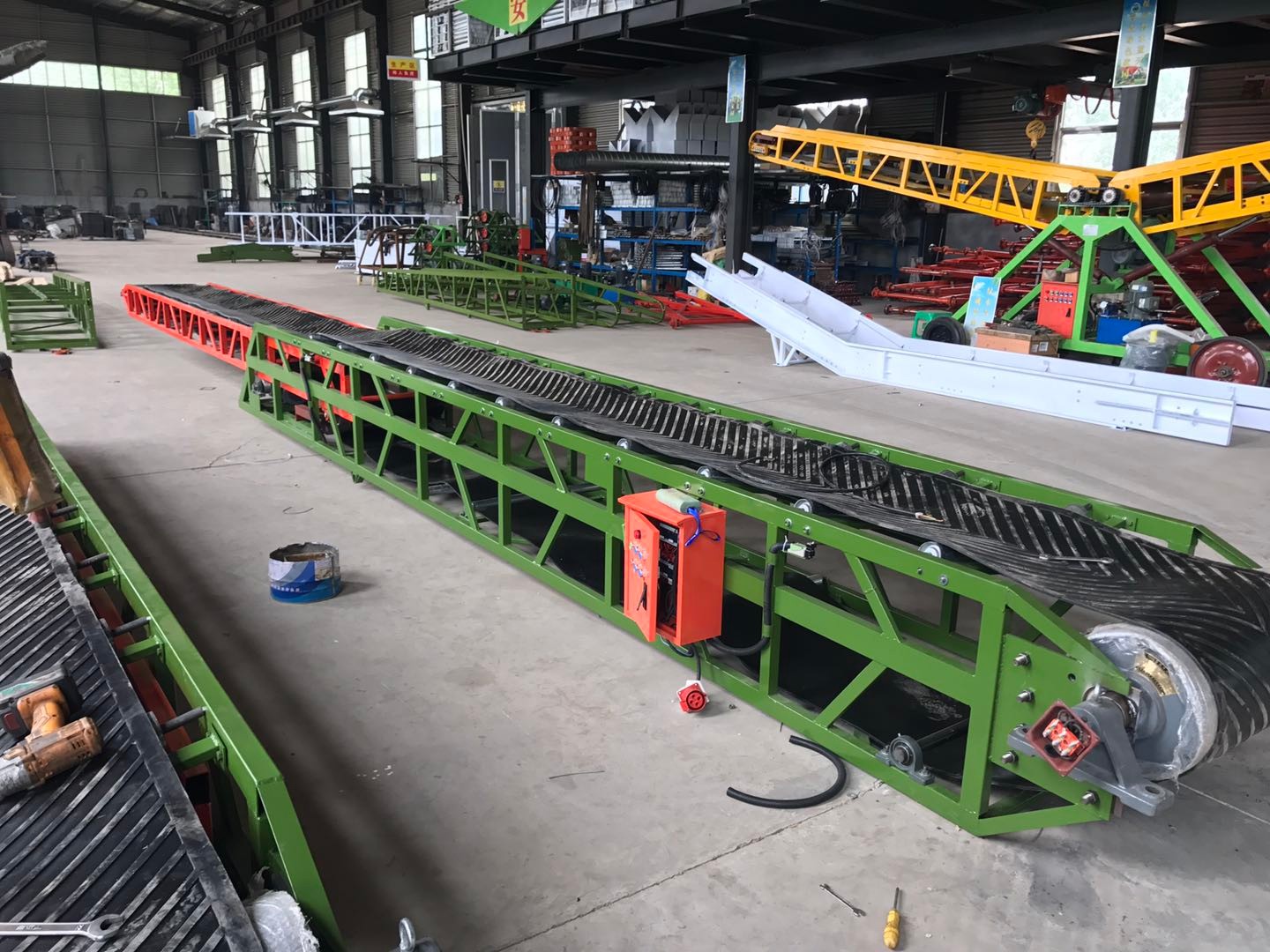大倾角带式输送机是主要的输送设备,主要输送大倾角物料。该设备占地少,运行可靠,维护方便。因此,它已成为许多生产企业生产大倾角输送和垂直提升物料的最佳输送机械。大型倾斜带式输送机主要由传动装置、传动滚筒、压力皮带轮、托辊和立辊、张紧装置、机架和头部漏斗等组成…
